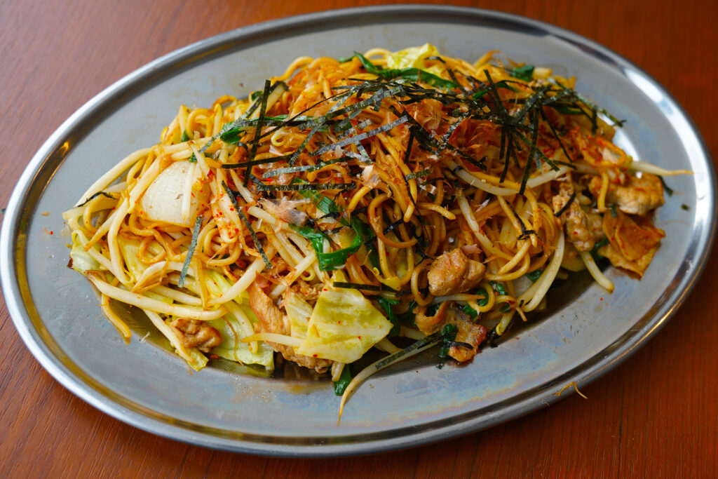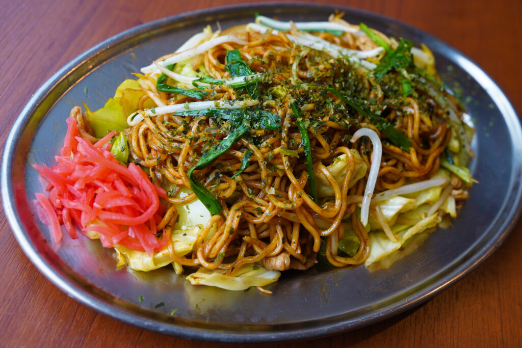 とにかく麺が美味い!カツオ出汁と醤油をベースに味付けをした和風テイストのヤキソバ。キャベツ、もやし、たまねぎ、にらと具沢山でボリュームのある一皿となっております。